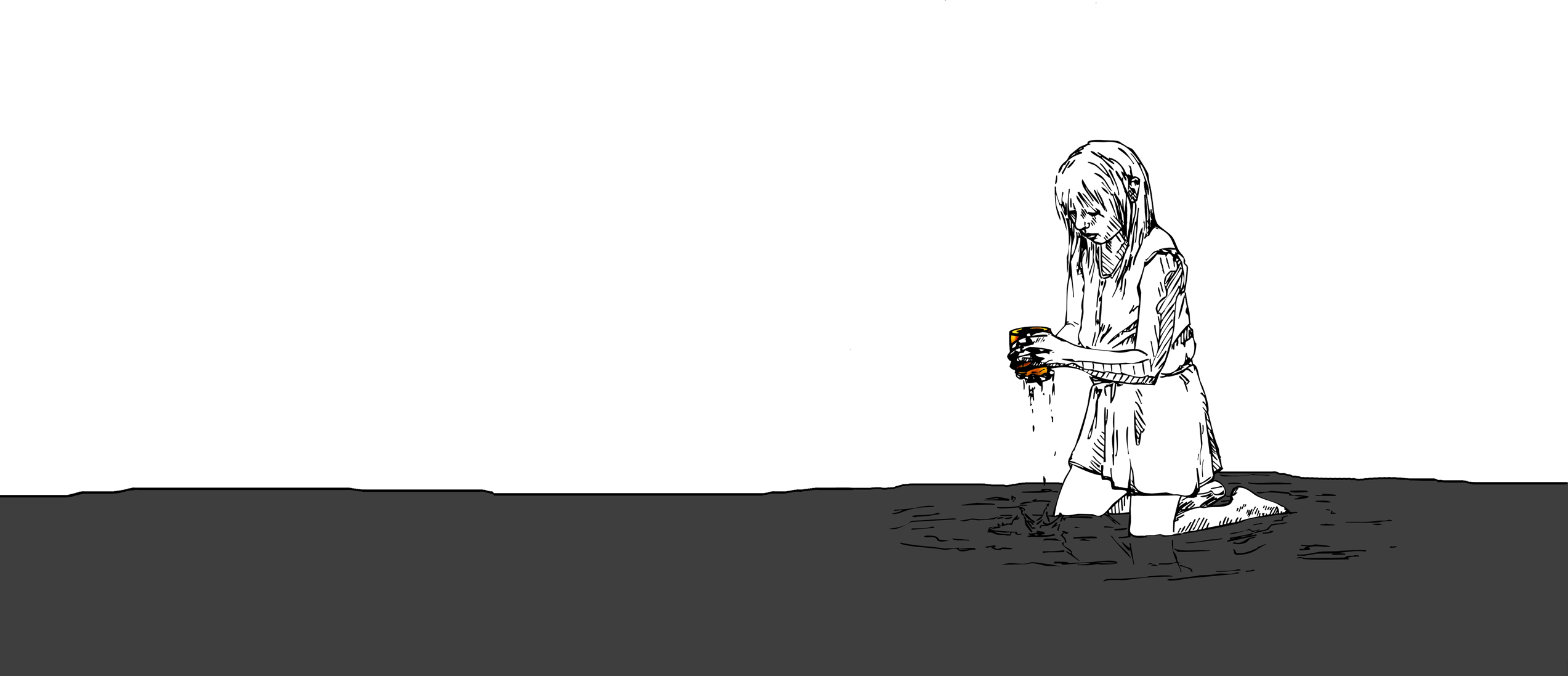 She couldn’t remember how long her pieces had been lying scattered in the flat like this. But she knew that the sound was back at some point. The same buzzing of the tv, the whispering and hissing from the tendrils on the walls. And she was kneeling on the living room floor, and, with her hands, scooping the liquid back into the small, coppery cup. Hand by hand, drop by drop. Her mother was still sitting on the sofa as if turned into stone and was staring at the screen. She had not noticed the girl who had burst into pieces right next to her. Neither did she notice the girl who was now crawling across the floor, picking up her heart from the corner of the room, scratched and covered in dirt, and pushing it carefully back into her chest.